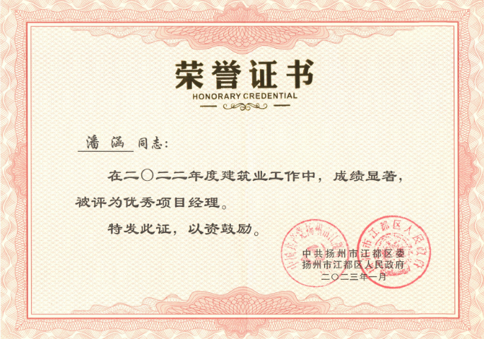 恭喜潘涵榮獲2022年度江都區(qū)優(yōu)秀項(xiàng)目經(jīng)理!...
